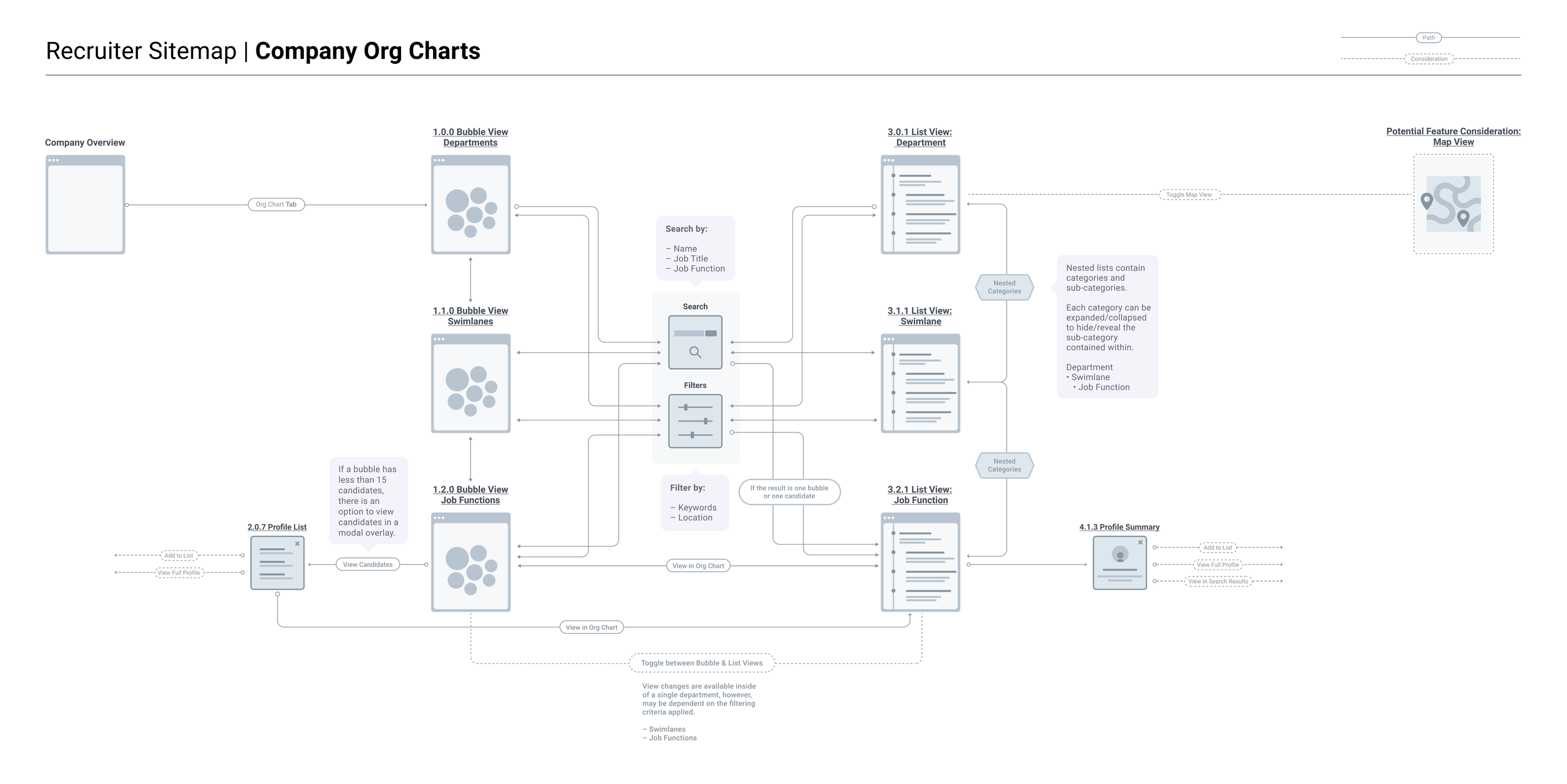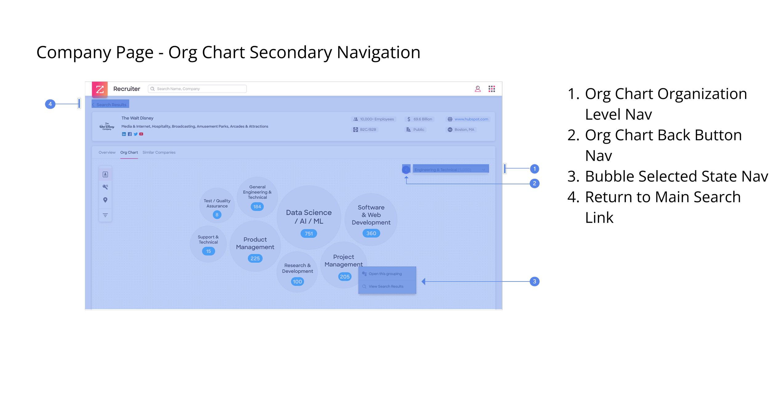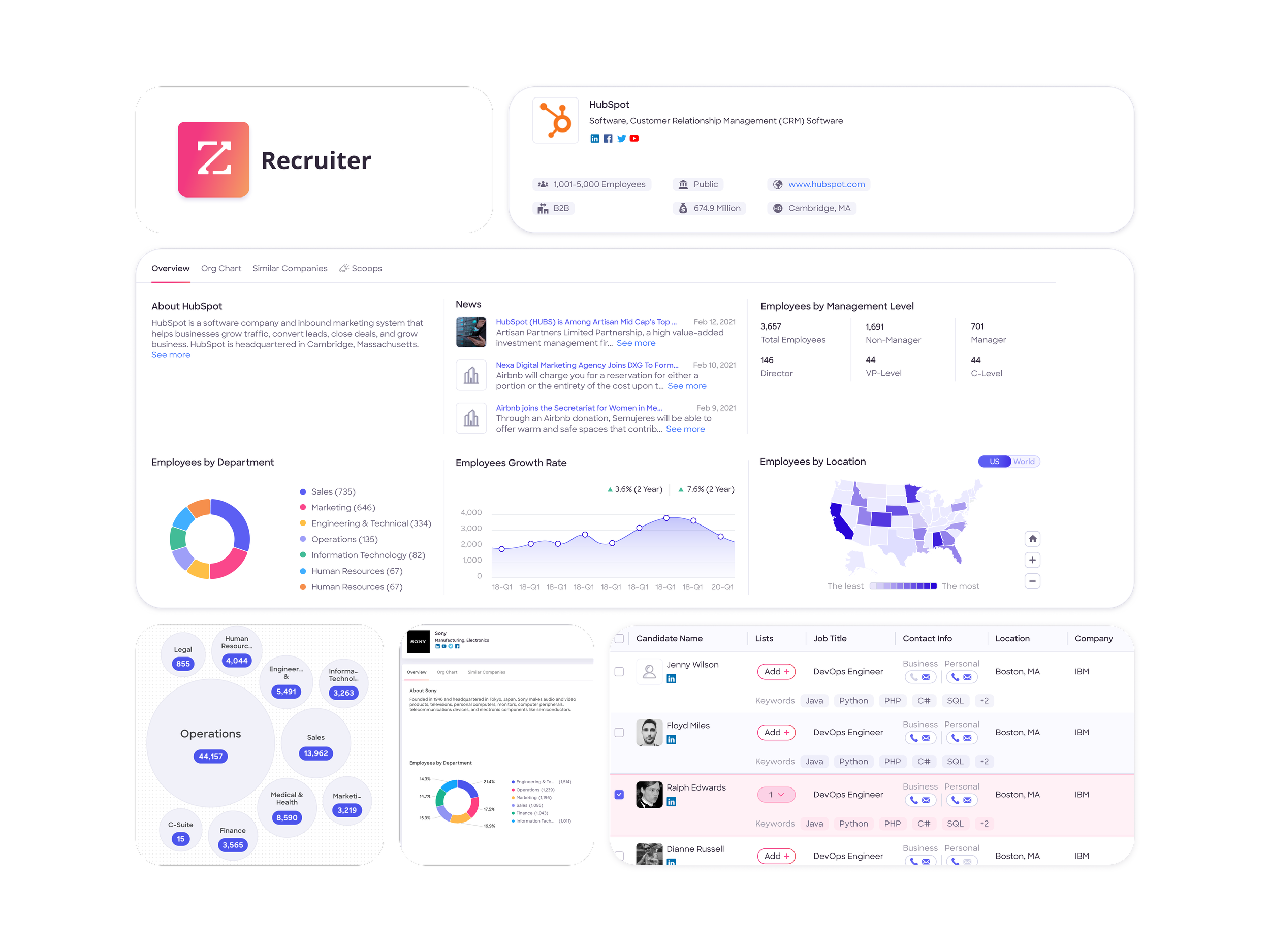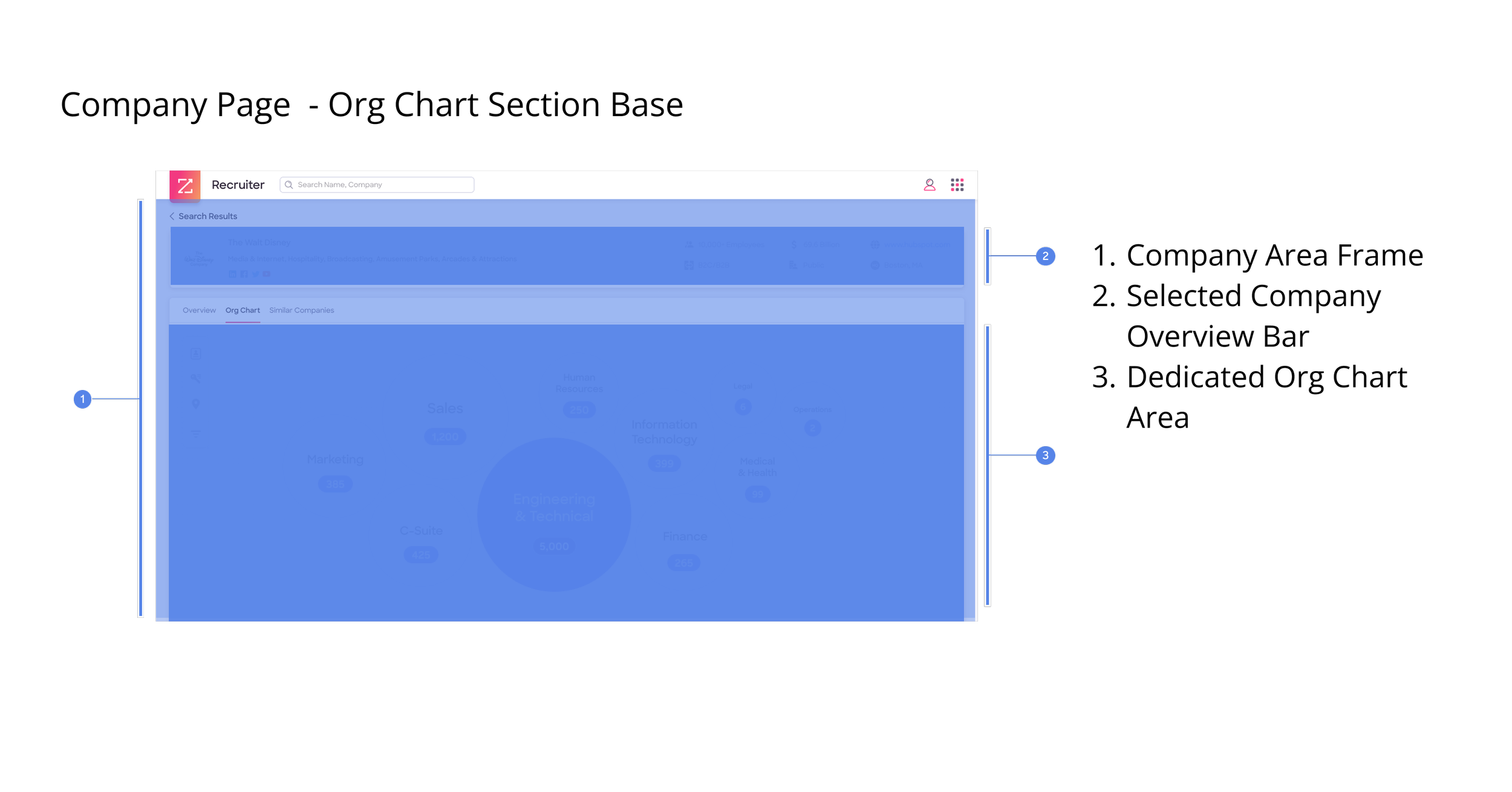 An interactive org chart & a comprehensive search that enables recruiters to easily explore companies, identify relevant job functions, and find the right candidates